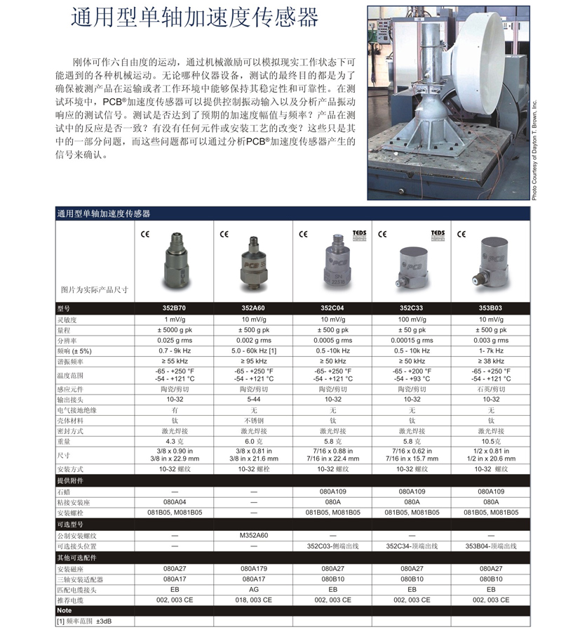PCB Piezotronics制造精密型振動(dòng)加速度計(jì)以滿足振動(dòng)、沖擊、加速度測量和運(yùn)動(dòng)監(jiān)測、控制和測試應(yīng)用。PCB Piezotronincs提供ICP、PE、MEMS和電容傳感技術(shù)用于實(shí)現(xiàn)各種各樣的測量要求。PCB生產(chǎn)的加速度計(jì)有單軸、雙軸和三軸可選。這些產(chǎn)品用于工廠生產(chǎn)和設(shè)計(jì)人員以及研發(fā)組織的現(xiàn)場測試,從來獲取關(guān)鍵數(shù)據(jù)。除精密小型傳感器外,PCB的IMI部門還提供堅(jiān)固的加速度計(jì)和振動(dòng)傳感器用于工業(yè)機(jī)器振動(dòng)監(jiān)控。由于不同的測試和工業(yè)環(huán)境有不同的安裝條件,所以PCB制造的加速度計(jì)具有各種不同的靈敏度、溫度、頻率響應(yīng)、振幅響應(yīng)、外形和引線的接地配置以滿足不同的需求。加速度計(jì)來評(píng)估設(shè)備或結(jié)構(gòu)性能的關(guān)鍵因素,因此,這樣的應(yīng)用通常需要整個(gè)測量系統(tǒng)的校準(zhǔn)證明,從傳感器到*終的輸出。美國PCB加速度傳感器352C04的每個(gè)傳感器出貨時(shí)都隨貨附帶一個(gè)可溯源到NIST的校準(zhǔn)證書。