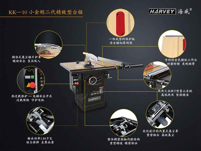 小金剛2代臺鋸KK10-II是海威多年來技術和工藝研究的結晶,其**的工藝、精度、**性和操作舒適性都處于世界同類產品的上等水平。本系列臺鋸適用于各種精密實木加工,廣泛應用與制作上等家具、櫥柜、樂器和工藝品等木器,也是廣大木工愛好者的必備利器,被木工界稱為“木工房King”,在過去的五年中,已有超過25000臺HW110系列臺鋸銷往世界30多個國家。